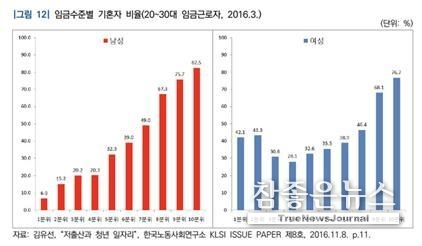 2016년 조사된 한국노동사회연구소의 분석 결과에 따르면 20~30대 임금노동자 남성은 임금 수준이 가장 낮은 1분위(임금 취업노동자집단 월임금 기준) 기혼자 비율이 6.9%이며, 임금이 가장 높은 10분위는 82.5%였다. 최저-최고 소득 집단의 혼인율이 약 12배 격차가 나고 있다. 1분위에서 10분위까지 임금 분위에 따라 기혼자 비율이 정확하게 비례해서 높아지며, 1분위부터 7분위(기혼자 비율 49%)까지는 기혼자 비율이 50%를 넘지 못하였다. (아래 표 참고)