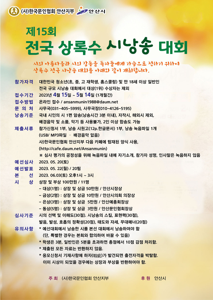 접수기간은 2023년 4월 15일부터 5월 14일간 한달 동안이며, 암송할 국내 시인의 시 1펀과 낭송 녹음파일을 신청서와 같이 메일로 보내주면 된다. 예선심사일은 5월 20일 토요일이며, 20팀을 선발한 후 본선 대회를 치를 예정이다. 본선은 6월 3일 안산문화예술의전당 다목적홀에서 개최한다.