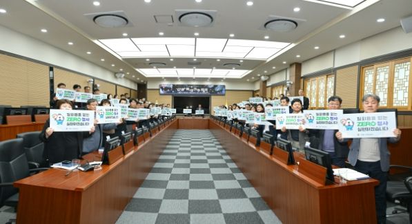 [참좋은뉴스= 기자] 거제시는 12월 1일 거제시청 중회의실에서 열린 확대간부회의 직후, 거제시장을 비롯한 간부 공무원 63명이 함께한 가운데 ‘1회용품 제로화 청사 선언’을 진행했다.