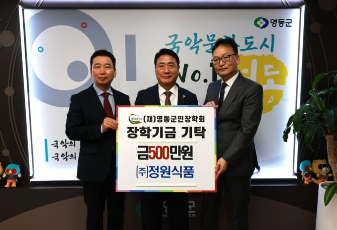 [참좋은뉴스= 기자] ㈜정원식품(대표 김훈섭)은 16일 오후 영동군청을 방문해 지역 미래 인재를 육성하기 위한 장학금 500만 원을 (재)영동군민장학회에 기탁했다.
