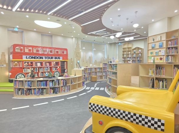 2층 어린이 독서공간은 기존 1층에서 보다 넓은 2층 공간으로 이전해 정형화된 서가 배치를 벗어난 자유로운 공간으로 조성했다. 또한 런던과 뉴욕을 콘셉트로 한 조형물 등 다양한 재미 요소들을 통해 기존 딱딱한 도서관의 이미지를 탈피했다.