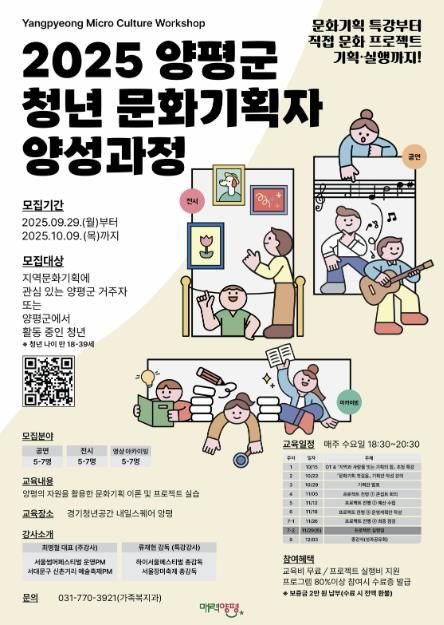 [참좋은뉴스= 기자] 양평군은 청년들의 문화·예술 기획 역량 강화를 통해 지역사회 문화 활성화와 청년 일자리 창출을 지원하고자 ‘2025년 양평군 청년 문화기획자 양성과정’을 10월부터 12월까지 운영한다고 밝혔다.