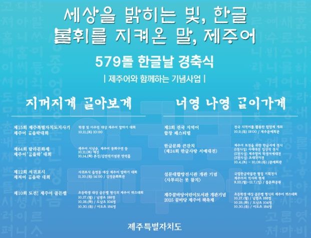 김인영 제주도 특별자치행정국장은 “한글은 우리 민족의 정신이자 문화의 뿌리, 제주어는 소중한 언어문화 유산”이라며 “이번 경축식을 통해 한글의 자부심을 되새기고 사라져가는 제주어에 대한 관심과 실천이 도민 생활 속에 자연스럽게 이어지도록 노력하겠다”고 말했다.