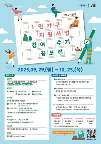 [참좋은뉴스= 기자] 서울시가 1인가구 지원사업의 성과를 공유하고 참여자들의 생생한 목소리를 담아내기 위해 '2025년 1인가구 지원사업 참여 수기 공모전'을 개최한다.