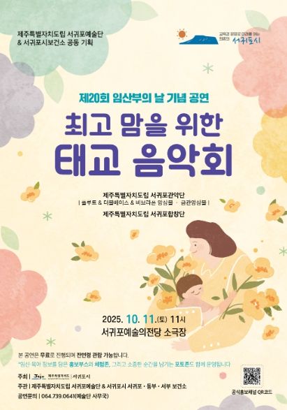 [참좋은뉴스= 기자] 서귀포시는 오는 10월 11일 11시 서귀포예술의전당 소극장에서 제주특별자치도립 서귀포예술단과 서귀포보건소가 공동으로 주관하는 제20회 임산부의 날 기념 공연 '최고 맘을 위한 태교음악회'를 개최한다.