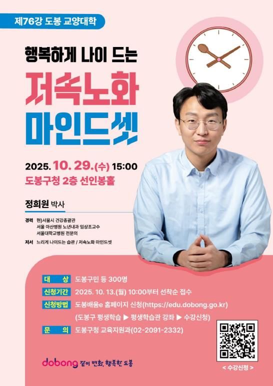 [참좋은뉴스= 기자] 서울 도봉구가 10월 13일 오전 10시부터 ‘저속노화 마인드셋’ 특강 참여자를 모집한다.