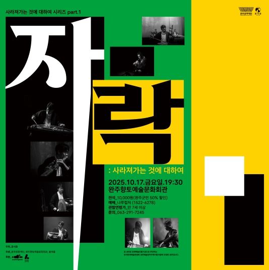 [참좋은뉴스= 기자] 전북 완주군에 깊어가는 가을밤, 사라져가는 토속 민요의 숨결을 현대적인 감각으로 재조명하고 재해석한 특별한 국악 공연이 펼쳐진다. 완주문화재단은 오는 10월 17일, 완주향토예술문화회관에서 국악앙상블 불세출의 '자락: 사라져가는 것에 대하여' 공연을 개최한다