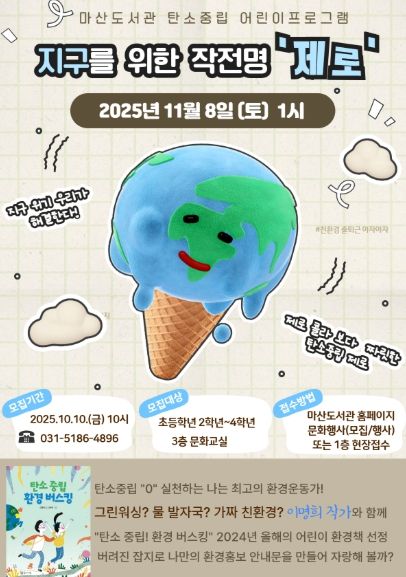 [참좋은뉴스= 기자] 김포시 마산도서관에서 오는 11월 8일 오후 1시부터 3시까지, 초등학교 2학년~4학년 어린이를 대상으로 탄소중립 어린이 프로그램 책풍당당 '지구를 위한 작전명 ‘제로’'를 운영한다.
