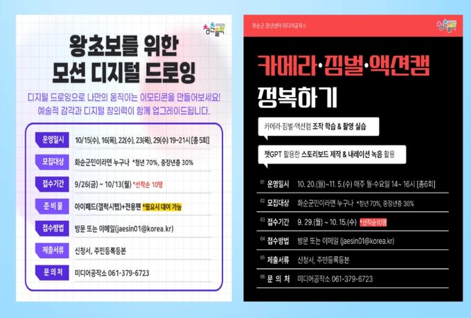[참좋은뉴스= 기자] 화순군(군수 구복규)은 오는 10월 15일과 20일 화순군 청년센터(청춘들락) 미디어공작소에서 영상 제작과 디지털드로잉 분야의 창의적 미디어 교육 프로그램을 시작한다고 밝혔다.