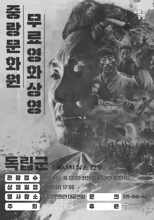 [참좋은뉴스= 기자] 중랑구는 오는 10월 14일 오후 3시와 5시, 중랑구민회관 대공연장에서 광복 80주년을 기념하는 영화 ‘독립군’을 상영한다. 이번 상영회는 중랑문화원이 주최해 선열들의 희생과 숭고한 뜻을 되새기는 특별한 자리로 마련됐다.
