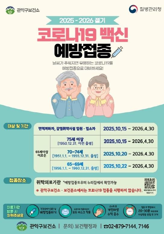 [참좋은뉴스= 기자] 관악구가 호흡기 질환이 증가하는 동절기 대비, 코로나19 감염 고위험군을 대상으로 코로나19 백신 무료 접종을 실시한다.