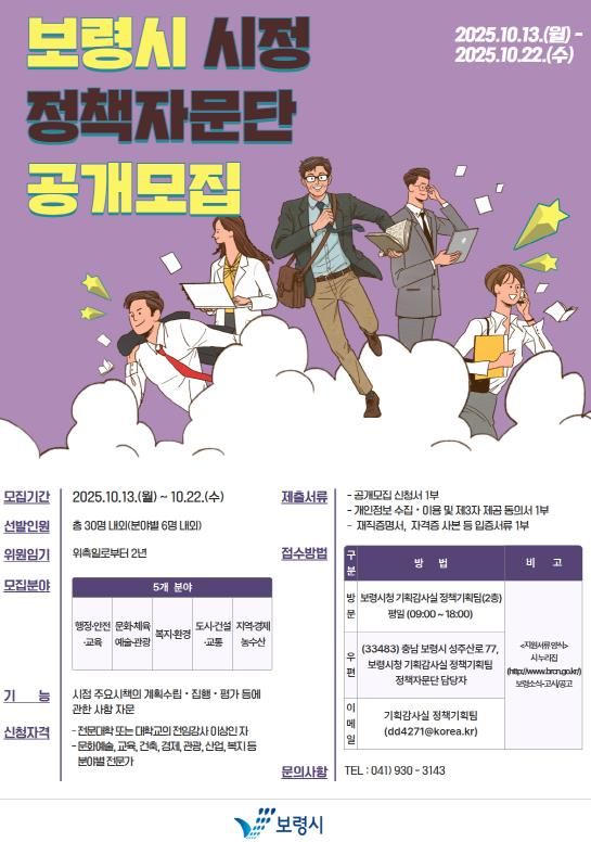 [참좋은뉴스= 기자] 보령시는 지역 시정 발전에 대해 조언·권고·건의 등의 자문을 얻고자 보령시 시정 정책자문단 신규 위원을 10월 13일부터 22일까지 10일간 공개 모집한다고 밝혔다.
