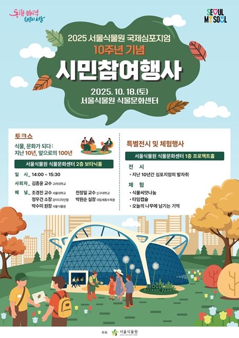 토크쇼 ‘식물, 문화가 되다: 지난 10년, 앞으로의 100년’은 10월 18일 오후 2시부터 3시 30분까지 식물문화센터 2층 보타닉홀에서 열린다. 지난 10년을 돌아보고 앞으로의 100년을 준비할 비전을 전문가들이 제시하며, 현장 질의응답을 통해 시민들과 소통하는 자리다.