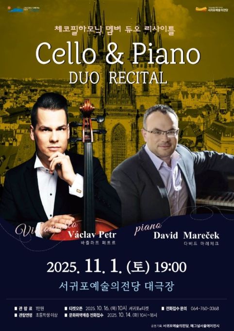 [참좋은뉴스= 기자] 서귀포시는 11월 1일 오후 7시, 서귀포예술의전당 대극장에서 체코필하모닉오케스트라 멤버 '첼로 & 피아노 듀오 리사이틀'을 개최한다고 밝혔다.