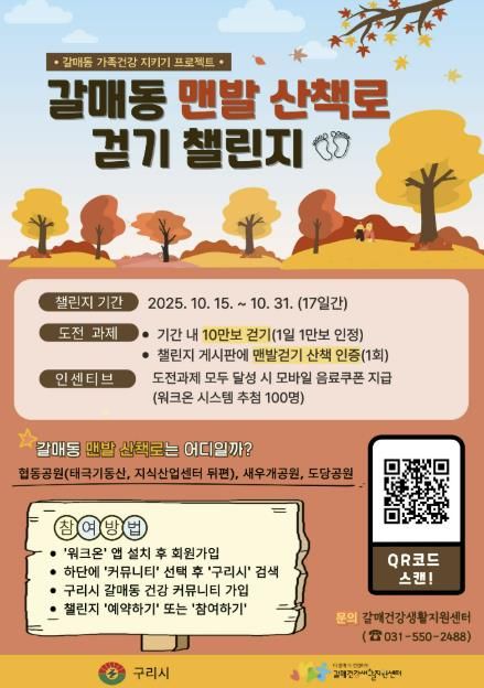 [참좋은뉴스= 기자] 구리시는 가을철 주민들의 건강한 생활 습관 형성과 스트레스 완화를 위해 ‘갈매동 맨발 산책로 걷기 챌린지’를 오는 10월 15일부터 31일까지 17일간 운영한다고 밝혔다.