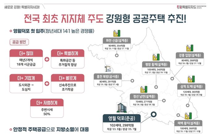 [참좋은뉴스= 기자] 강원특별자치도는 청년과 신혼부부 등 지역 정착 인구 확대를 위한 안정적인 주택공급을 목표로 전국 최초의 지자체 주도형 주거모델인 강원형 공공주택 사업을 적극 추진하고 있다고 밝혔다.