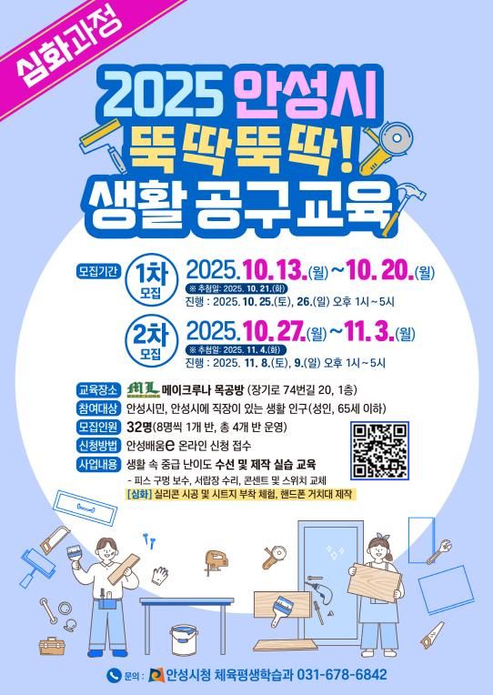 [참좋은뉴스= 기자] 안성시는 시민들의 생활 자립 역량 강화를 위해 '뚝딱뚝딱 생활 공구[심화과정] 교육'을 오는 10월 25~26일과 11월 8~9일, 총 2회 주말 일정으로 운영한다고 밝혔다.