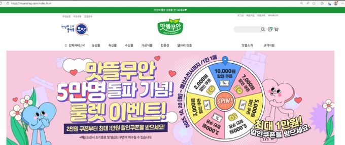10월 20일부터 시작되는 룰렛 이벤트는 ‘맛뜰무안몰’ 회원 누구나 참여할 수 있으며, 룰렛을 돌려 최대 1만원의 할인쿠폰을 무작위로 제공한다.