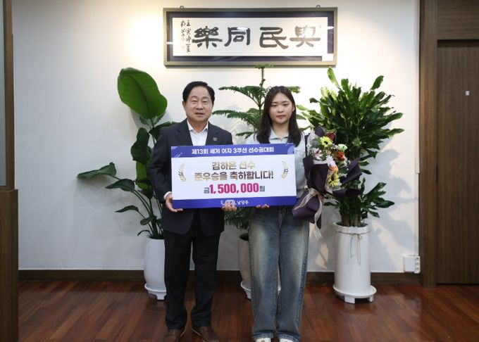 [참좋은뉴스= 기자] 남양주시는 10월 13일 시장 집무실에서 ‘제13회 세계 여자 3쿠션 선수권대회’ 준우승을 차지한 김하은 선수에게 포상금 150만 원을 전달했다고 밝혔다.