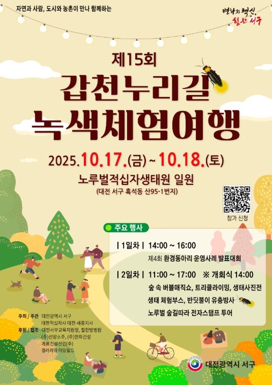 [참좋은뉴스= 기자] 대전 서구는 이달 17일부터 18일까지 노루벌 적십자생태원에서 자연과 환경을 사랑하는 시민들을 위한 ‘제15회 갑천누리길 녹색체험여행’을 대한적십자사 대전·세종지사와 공동으로 개최한다.