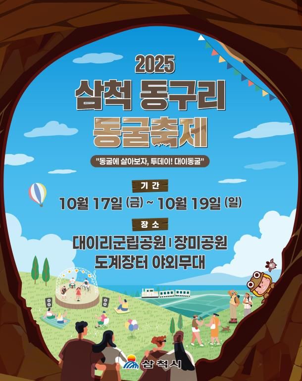 [참좋은뉴스= 기자] 삼척 동구리 동굴축제가 10월 17~19일 대이리군립공원(대이동굴)·삼척장미공원·도계장터 야외무대에서 동시에 열린다. ‘동굴에 살아보자, 투데이! 대이동굴’을 슬로건으로 한 올해 축제는 가족 공연과 실감형 동굴체험, 도심·생활권 무대를 셔틀망으로 연결하는 분산형 운영으로 하루 동선을 완성했다.