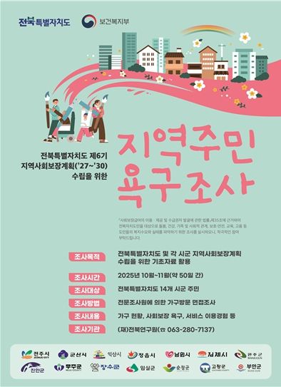[참좋은뉴스= 기자] 전북특별자치도가 지역사회 복지 욕구를 체계적으로 파악하고 주민이 체감하는 복지정책을 수립하기 위해 전 도민을 대상으로 지역주민 욕구조사를 실시한다.
