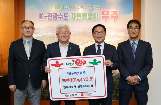 [참좋은뉴스= 기자] 현대자동차 신무주대리점은 지난 13일 무주군에 쌀 70포대(1포대 10kg)를 지정 기탁하며 훈훈함을 전했다.