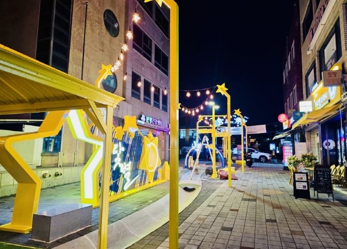 [참좋은뉴스= 기자] 문경시는 점촌원도심상권 130m 구간에 노란색 간판과 어닝을 새로 달고, 상징 조형물 13점, 조형벤치 20개를 설치했으며, 은하수 조명 18m와 360여 개의 파티등으로 ‘닻별 테마길’을 화려하게 완공했다.