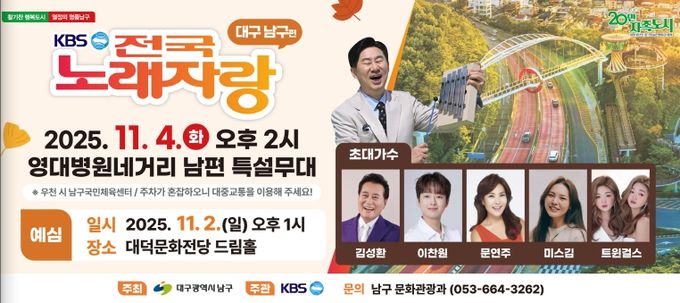 [참좋은뉴스= 기자] 대구 남구는 국내 최장수 인기 프로그램인 KBS 전국 노래자랑 ‘대구 남구편’이 오는 11월 4일 오후 2시, 영대병원네거리 남편 특설무대에서 열린다고 밝혔다.