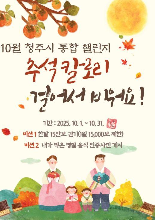 먼저 모바일 걷기 앱 ‘워크온(Walk-On)’을 활용해 청주시민 누구나 참여할 수 있는 ‘추석칼로리 걸어서 비워요’ 챌린지가 오는 31일까지 진행된다.