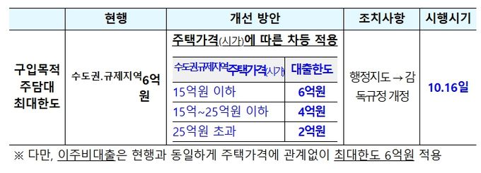 수도권·규제지역에 적용되는 주택구입목적 주담대의 대출한도(現 6억원)를 주택가격(시가) 수준에 따라 차등 적용한다. 수도권 · 규제지역의 ➊시가 15억원 이하 주택의 주담대 한도는 현행과 동일한 6억원, ➋시가 15억원 초과~25억원 이하 주택은 4억원, ➌시가 25억원 초과 주택은 2억원으로 대출한도를 차등 적용한다. 이를 통해 수도권·규제지역 내에서 대출을 활용한 고가주택 구입 수요를 보다 강력하게 관리해 나갈 예정이다.