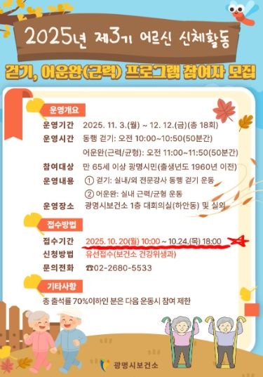 [참좋은뉴스= 기자] 광명시 보건소는 지역 어르신들의 건강한 노후를 지원하기 위해 ‘2025년 제3기 어르신 신체활동 프로그램’을 오는 20일부터 23일까지 4일간 모집한다.