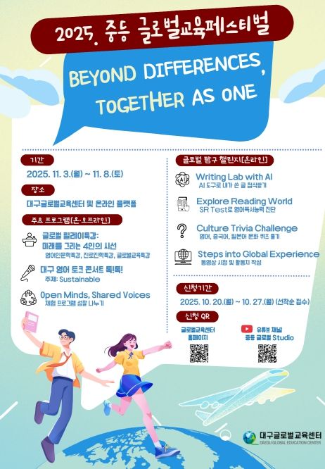 [참좋은뉴스= 기자] 대구교육연수원 산하 대구글로벌교육센터는 11월 3일부터 8일까지 ‘Beyond Differences, Together as One(차이를 넘어, 하나로)’을 주제로 '2025 중등 글로벌교육페스티벌'을 개최한다.