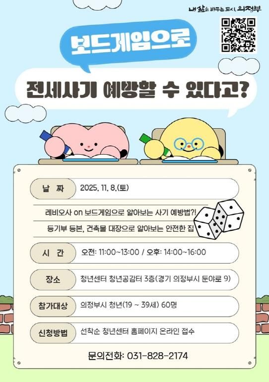 [참좋은뉴스= 기자] 의정부시는 11월 8일 운영 예정인 전세사기 피해 예방 교육용 보드게임 프로그램 ‘레비오사 보드ON’에 참여할 청년을 모집한다.