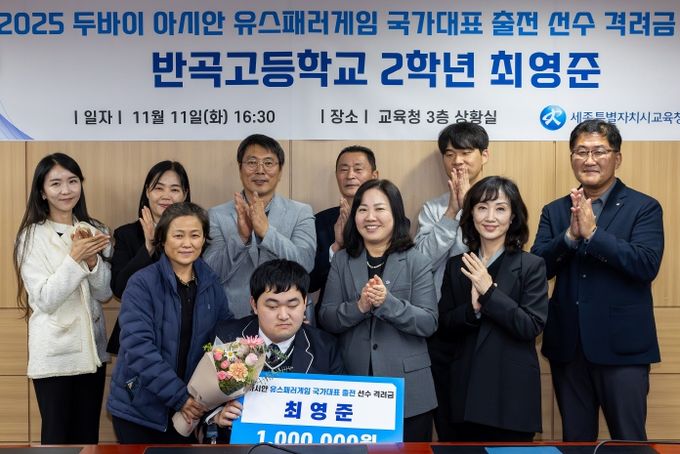 [참좋은뉴스= 기자] 세종특별자치시교육청은 반곡고등학교 2학년 최영준 학생이 12월 7일부터 14일까지 아랍에미리트 두바이에서 열리는 ‘두바이 2025 Asian Youth Para Games(아시안 유스패러게임)’ 뇌병변장애(F33) 원반던지기 종목에 국가대표로 출전함에 따라 함께 축하하고 격려했으며, 지원금 100만 원을 전달했다고 밝혔다.