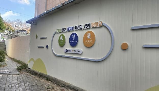 진천 농협 본점 근처에는 솔라등, 반사경, 계단 안전 손잡이를 비롯해 벽면 도장과 입체구조물을 설치했다.