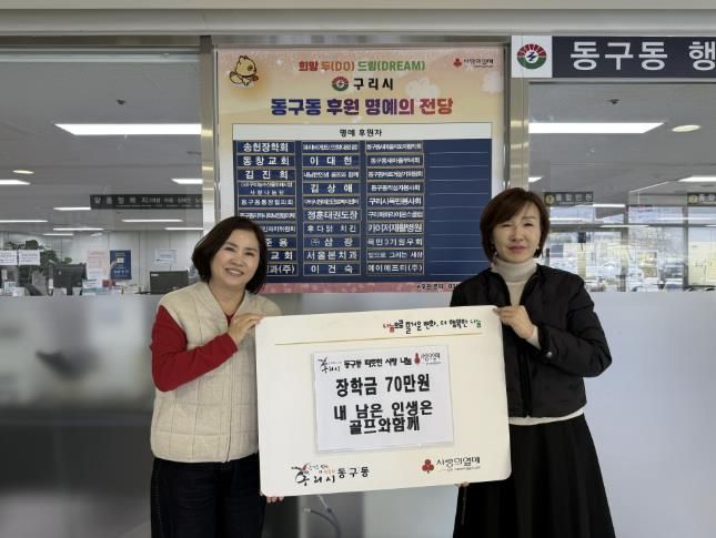 [참좋은뉴스= 기자] 구리시 동구동 행정복지센터는 지난 18일 동구동 행정복지센터 대회의실에서 '내 남은 인생은 골프와 함께' 모임으로부터 관내 취약계층 청소년을 위한 장학금 70만 원을 기탁받았다고 밝혔다.