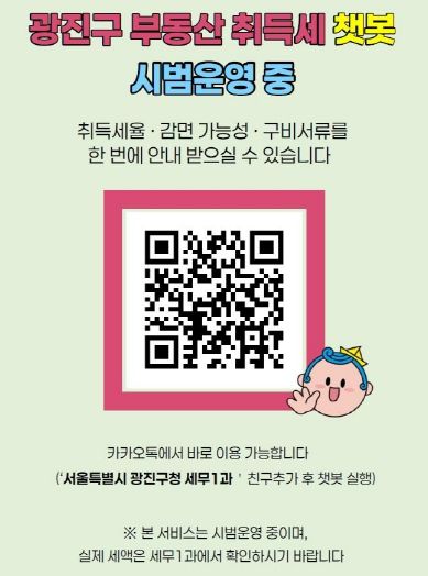 [참좋은뉴스= 기자] 광진구가 부동산 정책 변화에 따른 취득세 감면 확대와 직접 신고 증가에 대응하기 위해 카카오톡 기반 ‘부동산 취득세 안내 채팅로봇’을 시범 운영한다.