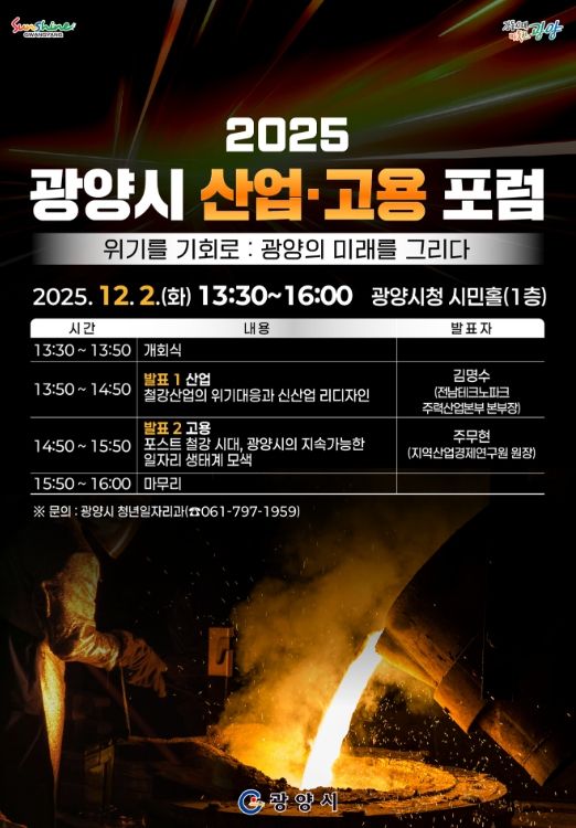 [참좋은뉴스= 기자] 광양시는 오는 12월 2일 오후 1시 30분, 시청 시민홀에서 ‘2025 광양시 산업・고용 포럼’을 개최한다고 밝혔다.