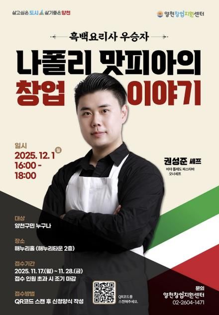 이번 특강은 관심있는 구민 누구나 참여할 수 있으며, 오는 28일까지 구청 홈페이지 공지사항을 참고해 사전 신청(QR코드 스캔)할 수 있다. 자세한 문의는 양천창업지원센터로 하면 된다.