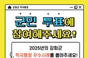 [참좋은뉴스= 기자] 강화군은 오는 10월 27일부터 10월 31일까지 5일간 강화군 홈페이지를 통해 ‘2025년 강화군 적극행정 우수사례 군민 투표’를 실시한다고 밝혔다. 이번 투표는 행정에 대한 군민의 체감도와 참여를 높이기 위해 마련된 것으로, 강화군 각 부서에서 제출한 18건의 적극행정 우수사례 중 1차 심사를 통해 선정된 8건을 대상으로 군민이 직접 우수사례를 선택할 수 있다. 투표는 강화군청 홈페이지 ‘적극행정 우수사례 투표’ 배너를 통해 간편하게 참여할 수 있으며, 투표 결과는 군 내부 심사 점수와 합산하여 ‘적극행정 우수사례 및 우수공무원’ 선정에 반영될 예정이다. 강화군은 이번 군민 투표를 통해 현장 중심의 적극행정 성과를 널리 공유하고, 공직자의 적극적인 업무 추진 문화를 확산시켜 나간다는 방침이다. 박용철 군수는 “군민이 체감할 수 있는 적극 행정은 진정한 소통의 출발점”이라며 “앞으로도 창의적이고 능동적인 공직문화가 정착될 수 있도록 적극행정을 지속적으로 추진하겠다”고 밝혔다. [뉴스출처 : 인천시 강화군]