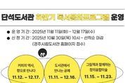 [참좋은뉴스= 기자] 경주시는 시민의 독서문화 향상과 자기계발 기회를 제공하기 위해 ‘2025년 단석도서관 하반기 독서‧문화 프로그램’을 11월 16일부터 12월 17일까지 운영한다고 밝혔다. 이번 프로그램은 경주 시민을 대상으로 △커피의 역사, 향으로 만나다(성인) △도서관에서 만나는 공예(성인) △그림책과 함께하는 창의융합미술(7세~초등학생) 등 총 3개 강좌로 구성됐다. 성인 강좌는 주 1회씩 총 6회, 어린이 강좌는 주말 총 4회 운영되며, 단석도서관 2층 자료실 내 유아실에서 진행된다. 참여 신청은 10월 30일 오전 10시부터 경주시립도서관 홈페이지를 통해 선착순으로 접수하며, 수강료는 무료다. 단, 일부 재료비는 수강생이 부담한다. 자세한 내용은 경주시립도서관 홈페이지를 참고하거나 단석도서관으로 문의하면 된다. [뉴스출처 : 경상북도 경주시]