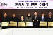 [참좋은뉴스= 기자] 용인특례시는 3일 본관 4층 전겹실에서 일자리 창출에 힘쓴 지역 우수기업 8곳에 인증서와 현판을 수여했다. 이번에 선정된 기업은 ▲아산디앤씨 주식회사 ▲일승푸드 제2공장 ▲주식회사 에이치에스씨 ▲㈜인실리코젠 ▲주식회사 홈체크 ▲㈜휴먼인텍 ▲케이제이건설산업(주) ▲트루션 등 총 8개사다. 시는 1차 서류심사와 2차 현장실사를 거쳐 일자리 창출 실적, 고용 안정성, 기업의 성장 가능성, 근로환경 등을 종합적으로 평가해 우수기업을 선정했다. 이들 기업은 최근 1년간 총 74명(기업당 4~19명)을 신규 채용해 지역 내 일자리 창출에 기여했다. 또, 다양한 직원복지제도로 근무하기 좋은 환경을 조성해 일자리의 질을 높이는 데 크게 힘쓴 것으로 평가됐다. 이들 기업에는 인증서와 현판이 수여되며, 시가 주최하는 일자리사업, 기업지원사업 참여 시 가점이 주어진다. 일자리박람회 등 채용 행사에도 우선적으로 참여할 수 있다. 용인특례시 일자리창출 우수기업 인증제는 2018년부터 시행되고 있으며, 매년 고용 확대와 일자리 창출에 기여한 기업을 발굴·지원하고 있다. &nb