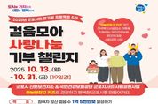 [참좋은뉴스= 기자] 군포시 산본보건지소는 오는 10월 13일부터 31일까지(19일간) 국민건강보험공단 군포지사와 함께하는 '걸음모아 사랑나눔' 기부챌린지를 운영한다. ‘걸음모아 사랑나눔’ 기부챌린지는 2023년부터 군포시와 국민건강보험공단 군포지사가 협력해 추진해 온 사회공헌형 걷기 사업이다. 시민들이 일상 속에서 걸음을 모아 목표를 달성하면 이를 기부로 연계해 취약계층에 전달하는 방식으로 진행되며 시민과 지역 내 기업·단체가 함께 참여해 건강한 나눔 문화를 지역사회에 확산시키고 있다. 기부챌린지는 군포시민 누구나 참여할 수 있으며 참여 기간은 10월 13일부터 31일까지이다. 참여방법은 워크온 앱을 설치한 뒤 ‘군포시 공식 커뮤니티’에 가입해 챌린지에 참여하면 된다. 챌린지 기간 동안 누적 목표 걸음 수 1억 5천만보를 달성하면 국민건강보험공단 군포지사에서 기부하는 총 100만 원의 기부금이 관내 아동복지시설과 지역아동센터 2곳에 전달될 예정이다. 김미경 군포시 보건소장은 “이번 챌린지는 단순히 건강을 위한 걷기를 넘어 시민 한 분 한 분의 발걸음이 모여 취약계층을 돕는 소중한 나눔으로 이어진다는 데 큰