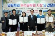 [참좋은뉴스= 기자] 고창군이 지난 17일 2025년 하반기 민원·국민신문고 응대 우수공무원을 선정해 시상식과 간담회를 열었다. 민원처리 우수공무원은 각 분야별로 5명씩을 선정하여 표창을 수여했다. 먼저, 국민신문고 분야는 민원처리 건수, 담당자의 민원요지 파악, 성실한 답변 등을 평가했다. 서민지 주무관(도시디자인과), 김민경 주무관(환경위생과), 고민성 주무관(사회복지과), 박재규 주무관(종합민원과), 유혜령 주무관(문화예술과)이 선발됐다. ‘민원처리 마일리지 분야’는 처리기간이 2일 이상인 법정 민원에 대해서 단축 일수를 마일리지로 적립해 누적 점수가 높은 공무원을 선정했다. 남혜원 주무관(사회복지과), 이민해 주무관(환경위생과), 송서경 주무관(신활력경제정책관), 전필규 주무관(사회복지과), 배재영 주무관(해양수산과)이 선정됐다. 고창군수는 시상식 이후 민원 처리 우수공무원들의 애로사항과 건의 사항을 청취했다. 고창군수는 “국민신문고 민원 처리와 민원 실적은 단순한 처리 건수를 넘어 국민의 불편 해소와 ‘신뢰받는 행정 구현’에 중요한 지표다”며, “앞으