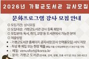 [참좋은뉴스= 기자] 가평군도서관은 2026년 도서관 문화프로그램을 운영할 강사를 공개 모집한다고 11일 밝혔다. 모집 대상은 가평군도서관 문화프로그램 운영을 희망하는 강사로 거주지 제한은 없으나 가평군 거주자 또는 인근 지역의 강사를 우선 모집한다. 모집 분야는 유아부터 성인을 대상으로 하는 독서문화 프로그램을 비롯해 취미, 교양, 체험 등 도서관에서 운영 가능한 분야이다. 모집 기간은 올해 12월부터 상시 모집하고 있으며 제출서류를 준비해 가평군 도서관 4개소(한석봉, 설악, 청평, 조종)에 방문 또는 가평군도서관 홈페이지 공지사항에 기재된 이메일로 제출하면 된다. 제출된 서류는 가평군도서관 강사인력풀에 등록 및 관리되며, 추후 도서관 문화 프로그램 운영을 위한 강사로 활동할 수 있다. 기타 자세한 내용은 가평군도서관 홈페이지 공지사항을 참고하거나 가평군도서관으로 문의하면 안내받을 수 있다. 도서관 관계자는 “이번 공개 모집을 통해 유능하고 열정 있는 강사를 모집해 지역 주민에게 다양하고 유익한 프로그램이 운영될 수 있도록 최선의 노력을 하겠다”고 밝혔다. [뉴스출처 : 경기도
