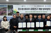 [참좋은뉴스= 기자] 장수군은 장수한우지방공사, 이티바이오텍(주), 전북대학교와 장수군청 회의실에서 장수한우 품질 고급화를 위한 ‘장수형 저탄소 종모우 개발’ 공동연구 상호협력 업무협약(MOU)을 체결했다고 11일 밝혔다. 이번 협약은 협약기관 간 상호 업무협조 체계를 구축해 장수 한우 산업의 경쟁력을 높이기 위한 장수 지역 사양환경에 적합한 우수 유전자원을 확보하고, 탄소배출을 줄이면서도 생산성과 품질을 높일 수 있는 종모우 개발을 위해 마련됐다. 특히 종모우 개발을 통해 장수 한우 고유의 유전형질을 확립하고 탄소배출 저감과 생산성 향상을 동시에 달성하는 것이 핵심 목표다. 협약에 따라 군은 저탄소 종모우 개발을 위한 사업 총괄 및 행·재정적 지원을 하고 장수한우지방공사는 채정·가공·사양관리와 농가 컨설팅에 나선다. 또한 이티바이오텍은 유전체 기반 연구개발을 진행하고 전북대학교는 유전 능력 평가와 우량 암소·후보 종모우 선발을 각각 담당한다. 장수군은 이번 공동연구를 최근 지정된 전북특별자치도 농생명산업지구 내 ‘저탄소한우 산업지구’ 조성사업과 연계해 2030년까지 단계적으로 추진할