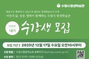 [참좋은뉴스= 기자] 수원시평생학습관이 12월 17일 오전 10시부터 2026년 1분기 수강생을 모집한다. 1월부터 3월까지 운영되는 1분기 강좌는 ▲첨단미래기술 프로그램 ▲디지털 지식정보 프로그램 ▲생활문화 프로그램 ▲교양 프로그램 ▲인문 프로그램 ▲기관 협력 재능기부 프로그램 ▲거북이공방 프로그램 ▲대상별 맞춤프로그램 ▲시민교육 프로그램 ▲언제든학교 시민기획 프로그램 ▲무지한스승의만남 시민참여기획 프로그램 등 총 11개 과정, 115개 세부 강좌로 구성됐다. 첨단미래 기술 프로그램을 강화했다. 인공지능(AI) 기술에 초점을 둔 첨단미래기술 프로그램, 성균관대학교 지능로봇리빙랩과의 협업을 통한 자율주행 실습, 가상현실(VR)드론 시뮬레이션 체험 등이 있다. 또 글쓰기, 사주명리학, 한글 서예, 현대미술, 명화감상, 뮤지컬 등을 주제로 한 교양 프로그램과 중장년, 시니어, 제2의 인생설계, 청소년 등을 대상으로 하는 대상별 맞춤 프로그램을 마련했다. 수원시는 새빛톡톡 시민 설문조사를 활용해 2026년 강사를 공개 모집했고, ▲생활문화 프로그램 ▲디지털 지식정보 프로그램 ▲대상별 맞춤프로그램 ▲첨
