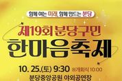 [참좋은뉴스= 기자] ‘제19회 분당구민 한마음 축제’가 오는 10월 25일 오전 9시 30분~오후 1시 중앙공원 야외공연장에서 열린다. 성남시 분당구가 후원하고 분당구민 한마음 축제 추진위원회(위원장 김성민)가 주최해 열리는 이번 행사는 지역사회 화합 분위기를 조성하고자 ‘함께 여는 미래, 함께 만드는 분당’을 주제로 진행된다. 이날 성남시립합창단과 시민 예술단 아인스바움의 공연으로 축제의 화려한 막을 연다. 이어 수내3동, 정자3동, 야탑1동, 백현동 주민자치센터 문화 프로그램에 참여 중인 4개 팀이 난타, 한국무용, 줌바, 에어로빅 등 흥겨운 공연으로 중앙무대를 꾸민다. 초청 가수 김용필(미스터트롯2 출신)의 ‘오히려 좋아’, ‘낭만의 계절’, 바이올리니스트 백진주와 소프라노 유경진이 듀엣으로 연주하는 영화음악(OST) ‘캐리비안의 해적’, ‘대부’, 성남청년프로예술단의 댄스 공연도 열려 축제 분위기를 달군다. 중앙공원 황새울광장에는 배틀 로봇, 4족 보행 로봇 등 6개의 4차산업 체험존, 시민 체험용 드론 축구존, 추억의 사진관을 차려 운영한다. 장애인 복합사업장인 굿윌스토어