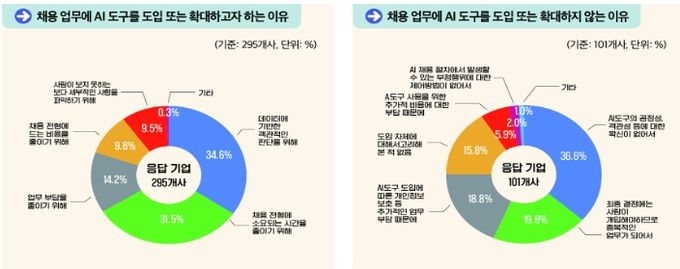 향후 채용 업무에 AI 도구를 도입·확대할 계획이 있는 기업은 74.5%(295개사)로 이들은 ‘AI 기반 인적성 또는 역량검사’(67.5%), ‘지원서류 검토’(63.4%), ‘채용 절차 관리’(55.6%) 등에 AI를 활용하겠다고 응답했다.